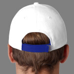 100% brushed heavy cotton twill; Structured; Mid-profile; 6-panel; Contrast under-visor; Sweatband and taping; Two-tone white crown with contrast embroidered stripes; Matching sewn eyelets;