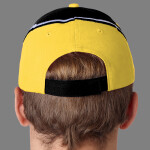 100% brushed heavy cotton twill; Structured; Mid-profile; 6-panel; Two-tone cut-and-sew crown; Embroidered white stripe on visor and circling crown; Contrast button; Eyelet and sandwich visor;