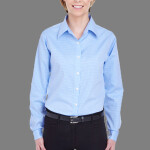 3.4 oz. easy-care 55% cotton, 45% polyester; Lightweight; Wrinkle-resistant; Feminine fit; Spread collar; Top-fused center placket; Collar and cuffs;